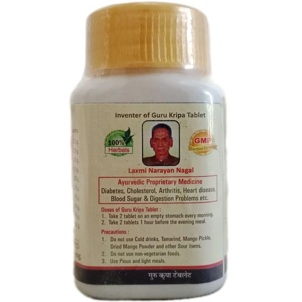 गुरु कृपा टैबलेट डायबिटीज(शुगर), गंठिया, कोलोस्ट्रोल एंव ह्रदय रोग में अत्यंत लाभदायक है यह औषधि शरीर में नेचुरल इंसुलिन का निर्माण करती है एंव खून को पतला बनाये रखने में सहायता करती है। यह चूर्ण पाचनक्रिया को मजबूत करता है एंव गंठिया की वजह से उत्पन शारीरक जोड़ो के दर्द हो दूर करती है सभी दस वन औषधि को चंद्रमा के विशेष नक्षत्र में मिश्रण किया जाता है इसमें चार ऐसी औषधि है जिसे चतुर्फ़ल कहते है जिससे इस औषधि का असर बढ़ जाता है