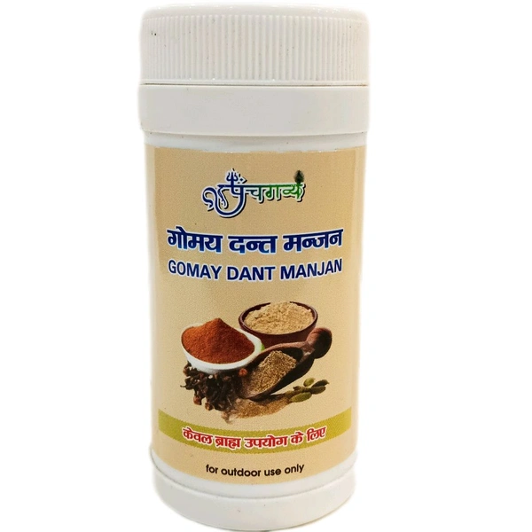 पंचगव्य दंत मंजन एक प्रकार का टूथ पाउडर है जिसका उपयोग दंत स्वच्छता के लिए किया जाता है। यह सौना गेरू, हरड़, पिपली, लौंग, मिर्च, खड़िया मिट्टी नीम चल, गौमय क्षार , मसाले और खनिजों जैसे प्राकृतिक अवयवों के मिश्रण से बना है, जिनके बारे में माना जाता है कि इसमें एंटीसेप्टिक गुण होते हैं। पाउडर को आमतौर पर टूथब्रश या उंगली का उपयोग करके दांतों और मसूड़ों पर लगाया जाता है और फिर पानी से धो दिया जाता है।पंचगव्य लाल दंत मंजन" को मौखिक स्वच्छता बनाए रखने, दांतों की सड़न और मसूड़ों की बीमारियों को रोकने, सांसों को तरोताजा करने और समग्र दंत स्वास्थ्य को बढ़ावा देने में मदद करने के लिए माना जाता है।
