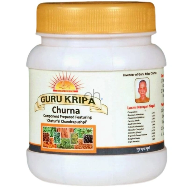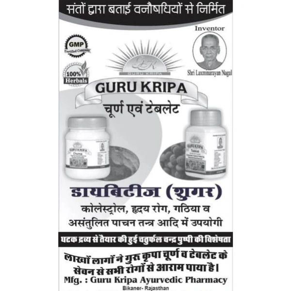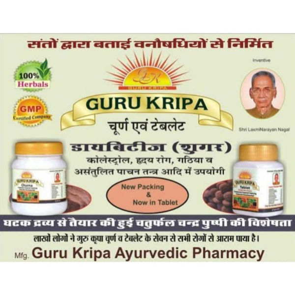 गुरु कृपा चूर्ण डायबिटीज(शुगर), गठिया, कोलोस्ट्रोल एंव ह्रदय रोग में अत्यंत लाभदायक है यह औषधि शरीर में नेचुरल इंसुलिन का निर्माण करती है एंव खून को पतला बनाये रखने में सहायता करती है। यह चूर्ण पाचनक्रिया को मजबूत करता है एंव गंठिया की वजह से उत्पन शारीरक जोड़ो के दर्द हो दूर करती है सभी दस वन औषधि को चंद्रमा के विशेष नक्षत्र में मिश्रण किया जाता है इसमें चार ऐसी औषधि है जिसे चतुर्फ़ल कहते है जिससे इस औषधि का असर बढ़ जाता है