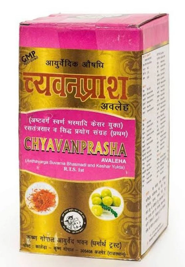 च्यवनप्राश स्वर्णभस्म, केसर आदि युक्त घटक द्वव्य:- पाटला ,अरणी ,गम्भीरी ,बेल ,श्योनाक ,गोखरू ,शालपर्णी ,पृष्णपर्णी ,कटेली ,पीपल,काकड़ासिंगी ,मुनक्का ,गिलोय ,हरड़ ,खरैटी ,भूमि आंवला ,अडूसा, जीवन्ती ,कचूर ,नागरमोथा,पुष्करमूल,माष्पर्णी ,तिल तैल ,विधारीकन्द ,सांठी ,इलायची,अगर,चन्दन ,जीवक ,ऋषभक,मैदा,महामेदा ,काकोली,क्षीरकाकोली ,ऋद्धि ,वृद्धि ,घी ,शर्करा ,पीपल,वंशलोचन ,दालचीनी ,नागकेशर,तेज़पत्ता ,रस सिंदूर ,ताजा आवला ,जसद भस्म ,अभ्रक भस्म 100 पुटी ,स्वर्ण भस्म ,केसर।