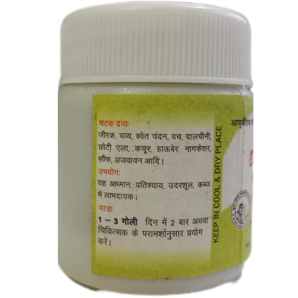 "DHANANJAY VATI" IS AN AYURVEDIC MEDICINE USED IN AYURVEDIC TREATMENT. IT IS CONSIDERED USEFUL IN THE TREATMENT OF PRATISHYAYA (COMMON COLD), ADHMAN (FLATULENCE), UDARA SHOOLA (ABDOMINAL PAIN), CONSTIPATION, AND VARIOUS STOMACH-RELATED PROBLEMS.