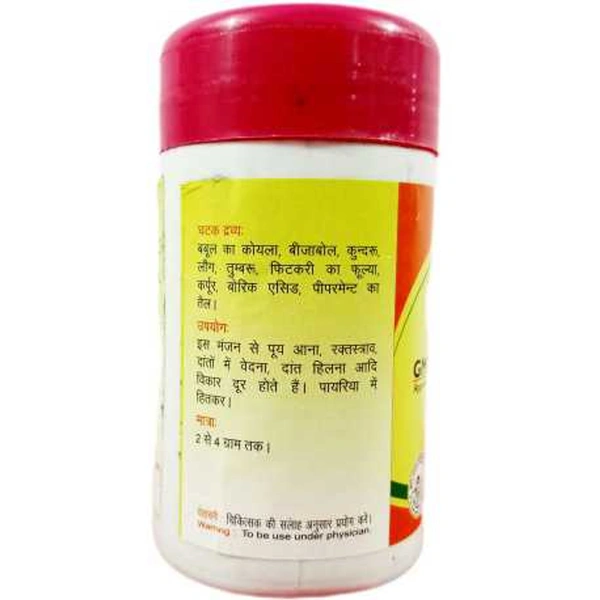 इस मंजन से पूरा आना, रक्तस्त्राव दांतों में वेदना, दांत हिलना आदि विकार दूर होते हैं। पायरिया में हितकर।
