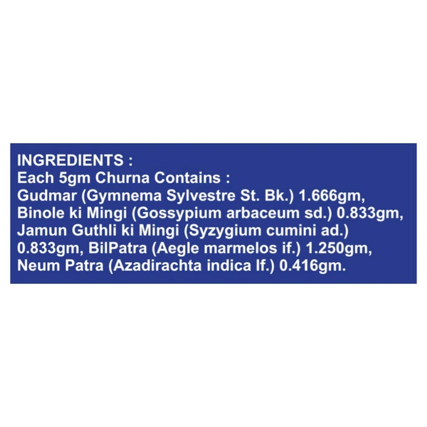 घटक द्रव्य: गुड़मार पत्ती, बिनौला मींगी, जामुन की गुठलियों की मींगी, सूखे बिल्व पत्र, शुष्क नीम पत्र ।